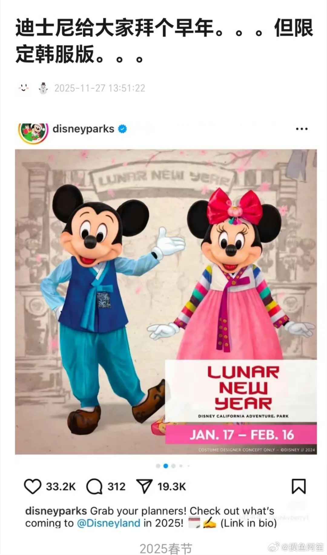 主题:动物城2虽然没有演员的黑历史被冲,但是迪士尼有吧,美国老家的迪士尼乐园过农历春节,米奇穿的是韩国古装服饰,始终是挪用 [4]