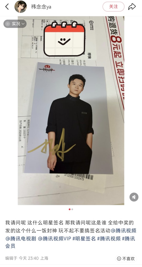 主题:鹅视频搞活动,给中奖网友发明星签名照,结果给人家发它们综艺《一饭封神》的参赛厨师的签名照,哈哈哈哈哈哈哈哈哈哈哈哈哈哈 [2]