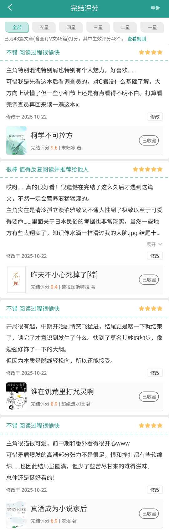 写得有点乱,可以看我附上的图:图上的这些文(还有更多我没截到的文),我留下完结评分的时间不一,23、24、25年都有,也都在不同月份发布。但就是因为我把它们加入了我制作的书单(书单里对它们的评价和评分一字未改),它们的“最后修改于”时间全都变为了今天。