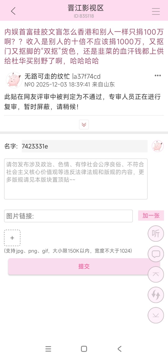 主题:[APP6.8.1]山东ip的朱一龙粉丝有什特权吗,一直在发反华辱华造谣网暴的贴子,管理员请尽快将它永禁 [1]