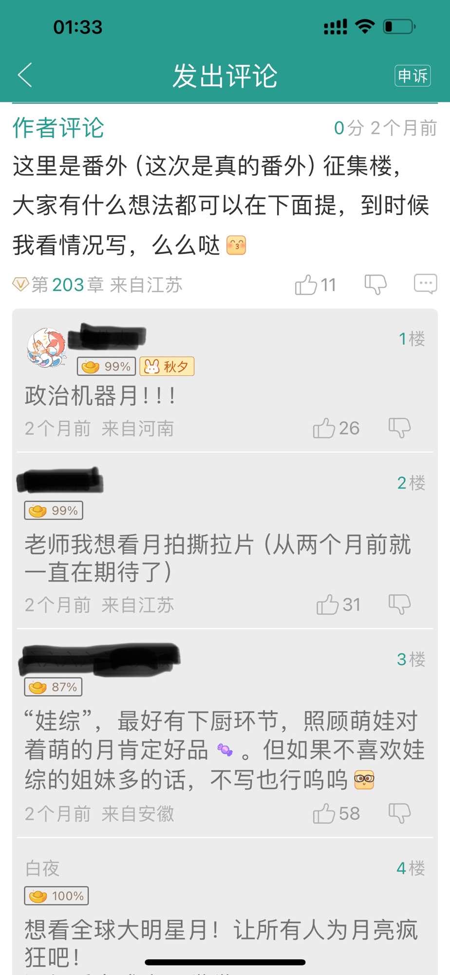 今天点开我自己的“发出评论”,发现很多文的作者评论都在我这里置顶了。我请问呢?这是我的账号还是作者的账号?我点开就是想看我自己的评论,而不是作者的,想看作者的评论,我会点开他的文好吗?尤其是有些作者的置顶评论字特别多,拉一长串下来全是预收。这是在干什么?作者专栏有预收文不够,还要把手伸到读者账号里,怼我脸上是吗?